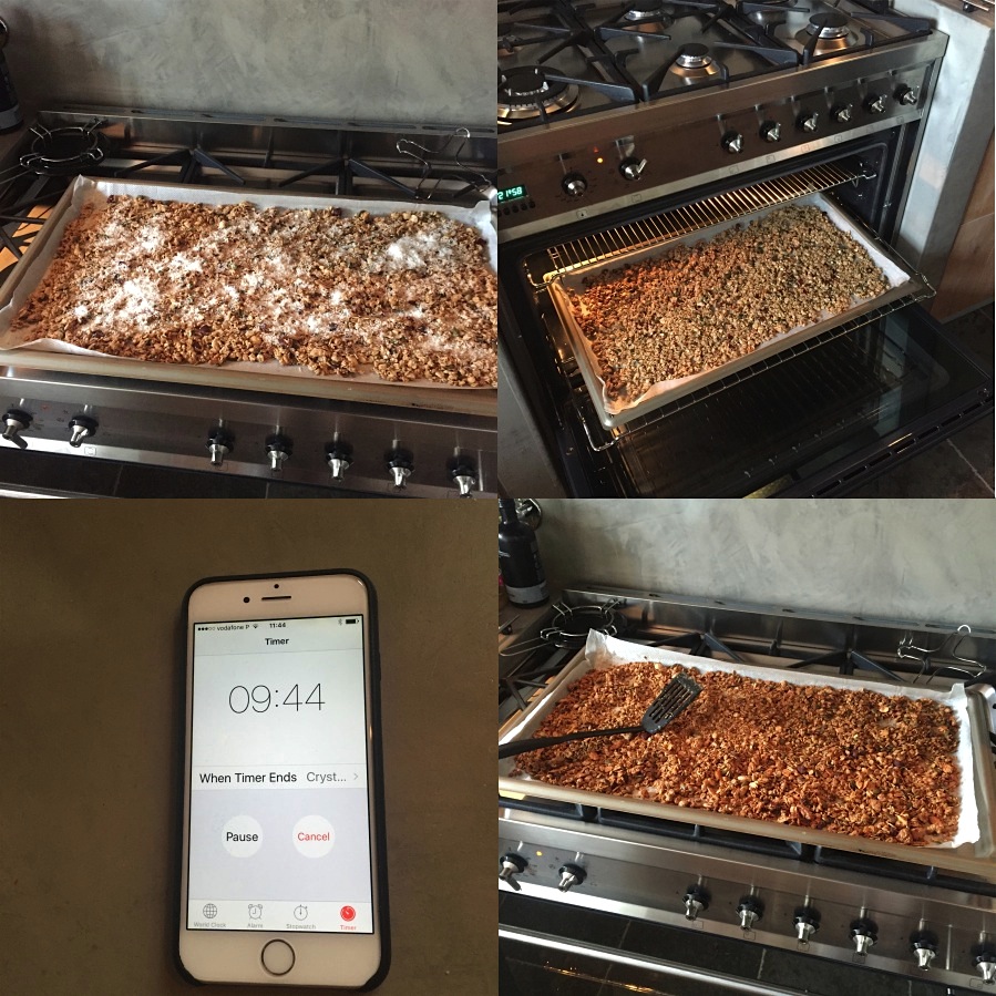 I start with mixing the coconut oil (liquefy au bain-marie), vanilla and honey/syrup in one bowl. Mix the oats, seeds and (chopped) nuts in another bowl. For now without the coconut flakes, you’ll need these only after the first baking time. Then add the ‘dry’ into the ‘liquid’ bowl. Either toss with utensils or get your clean hands dirty. The easy way to gain a quick even mixture. Toss and turn!