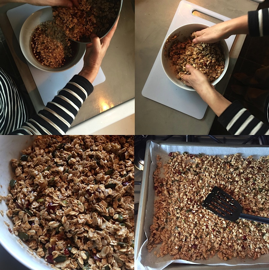 Since it is hard to find granola – under 10 euro – that doesn’t contain loads of refined sugar or is raisin-free, I started to make my own. Blindfolded by now, if I have to.